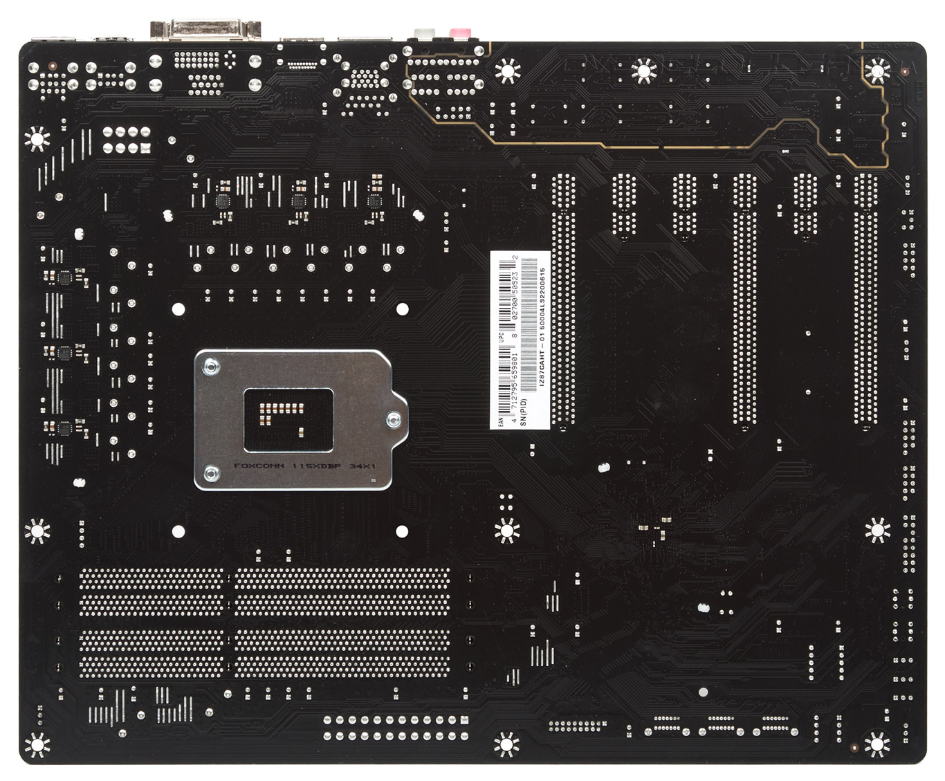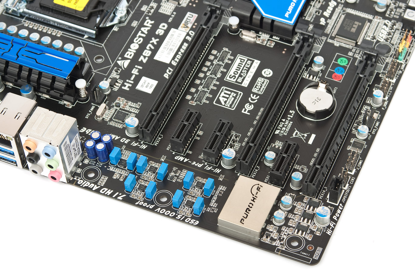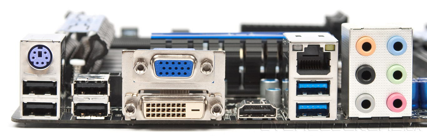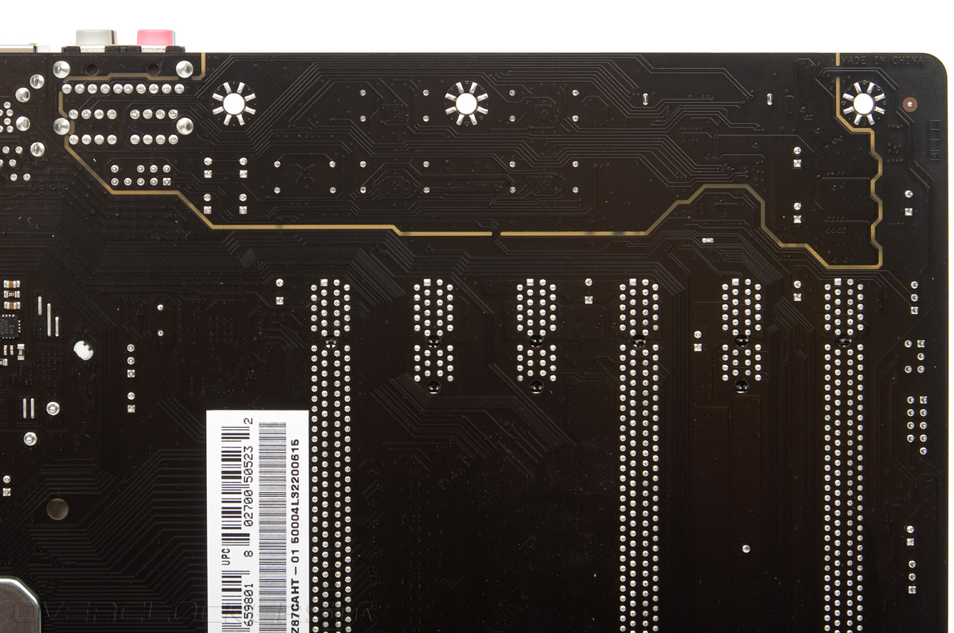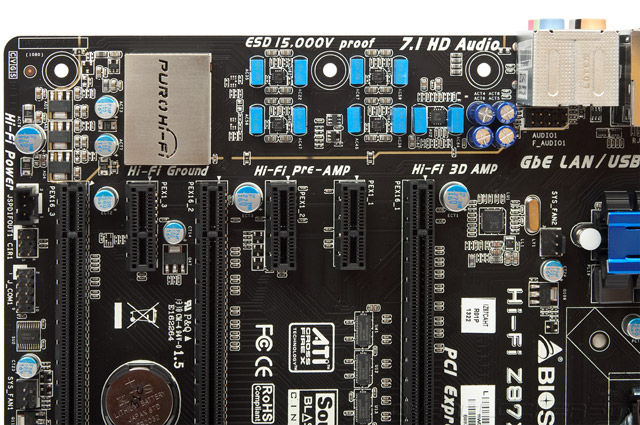 Расположение и конфигурация слотов расширения PCI-E являются уже классическими для ATX-продукта на основе Z87. Отсутствие верхнего гнезда позволит беспрепятственно использовать практически любую систему охлаждения ЦП.