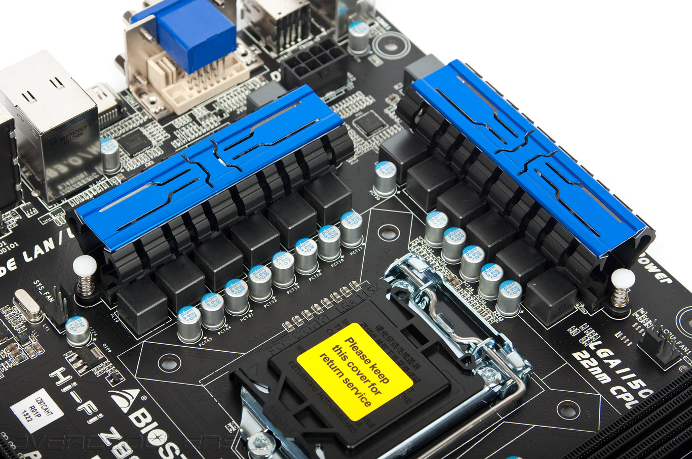 В основе 12-канального преобразователя напряжения лежит ШИМ-контроллер компании Intersil Corporation — ISL6376. К нему в помощь приставлены шесть драйверов-удвоителей ISL6611A. Такие же использовались и на плате ASRock Z87 Extreme6. Если у конкурента роль силовых элементов выполняют особые Dual-Stack транзисторы, то здесь используется по паре обычных, исполненных в корпусе LFPAK — PH6030L и PH9030L.