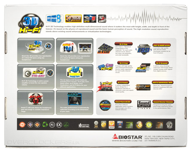 На обратной части коробки более широко раскрыта суть всех технологий. Обращает на себя внимание программный комплекс Sound Blaster Cinema от компании Creative, который мы рассмотрим в обзоре ПО. Касаемо самой материнской платы и её возможностей, то здесь нет ровным счётом ничего — нет фото, нет таблицы с её характеристиками, поэтому остаётся довольствоваться краткой информацией, приведенной рядом с серийным номером на левом боку коробки.