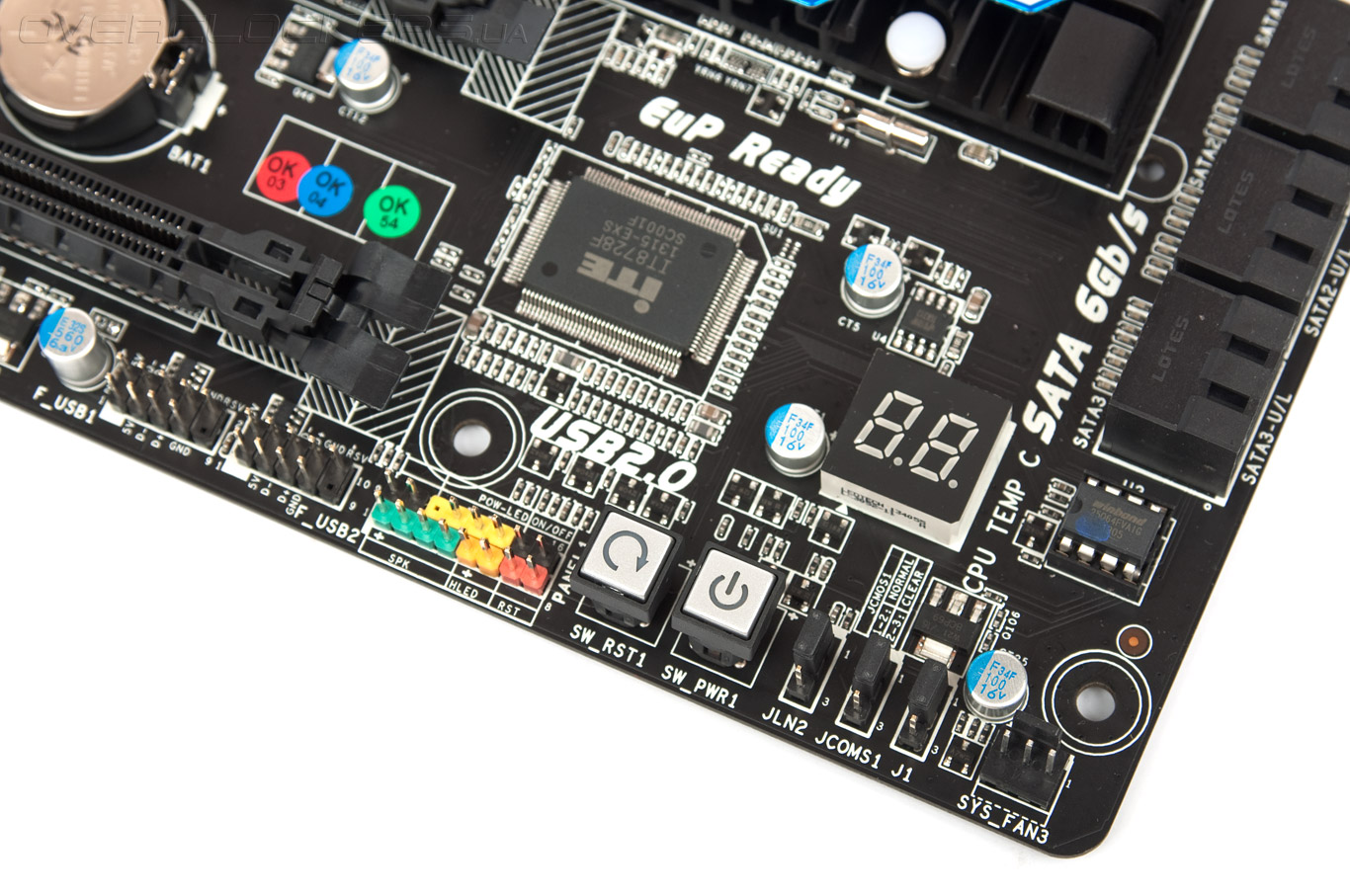 У правого нижнего угла расположились кнопки включения и перезагрузки. Первая обладает красной подсветкой, вторая — зелёной. Необычно её предназначение — зелёным светом отображается активность накопителей в системе. Безусловно, они активны лишь в момент работы компьютера. Для сброса настроек придётся воспользоваться перемычкой. Функционал соседних контактных групп остаётся загадкой: если аббревиатура LN2 вполне понятна, то вот правый сосед вообще безымянный. Никакими пояснениями руководство пользователя не обладает.