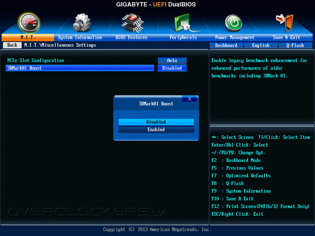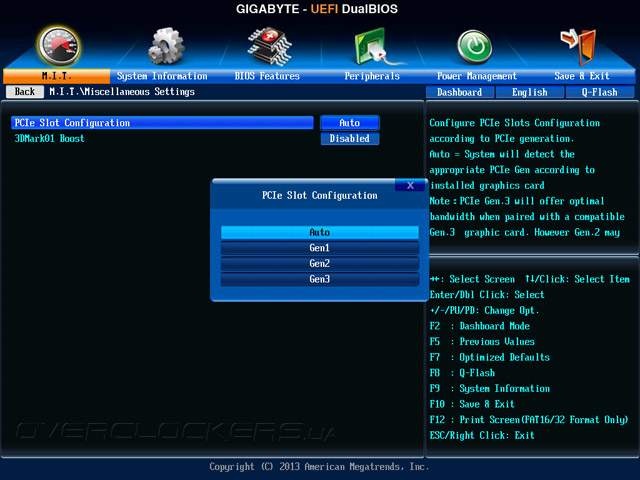 Завершающий раздел M.I.T пункт именуется как Miscellaneous Settings. Здесь оказались настройки генерации интерфейса PCI-E и волшебная кнопка для повышения производительности системы в старых, по уверению описания, бенчмарках.