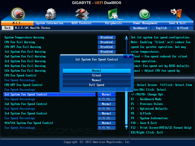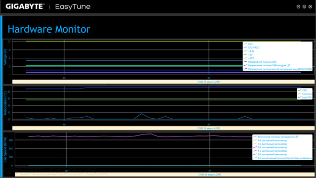 VCCIOA появляется в разделе мониторинга — PC Health Status. Наполнение этого раздела вопросов не вызывает, отслеживание показателей происходит в режиме реального времени. Скорость работы вентиляторов отображается лишь для четырёхконтактных площадок, то есть для двух процессорных и пяти системных. Две оставшиеся на плате трёхконтактные колодки окажутся не то что без управления, а даже без мониторинга состояния работы подключенных к ним охладителей. Мы не станем подробно останавливаться на встроенном в UEFI алгоритме управления, уповая на расширенные возможности фирменного ПО.