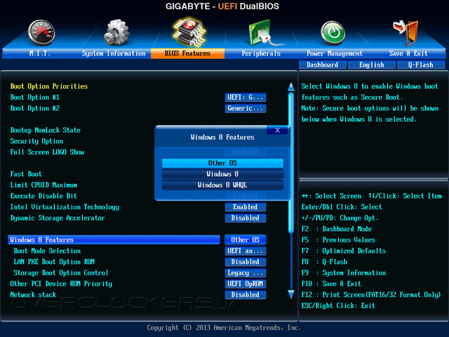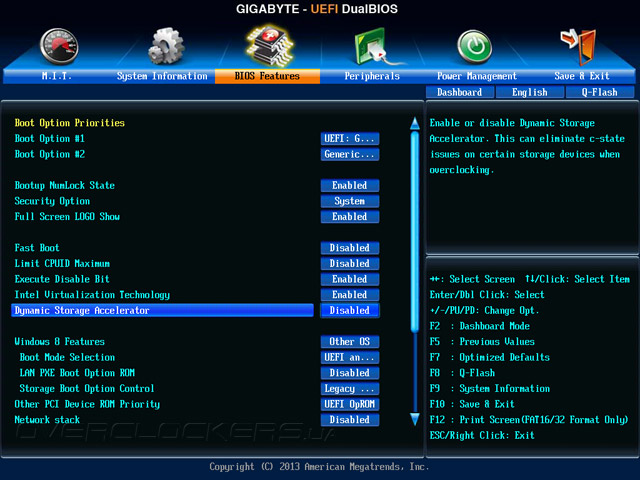 Пройдёмся по интересным особенностям. В разделе BIOS Features происходит настройка процедуры инициализации самой платы и установленных на ней компонентов. Так, Fast Boot по умолчанию отключён. Рядом можно активировать Dynamic Storage Accelerator — часть программы Intel Rapid Storage, которая, по уверению производителя, позволяет повысить производительность накопителей. Навязываемые новшества новой ОС от Microsoft также выключены, но, при желании, их можно задействовать. В этом случае появится ещё один пункт UEFI, повсеместно присутствующий у других производителей — CSM Support.
