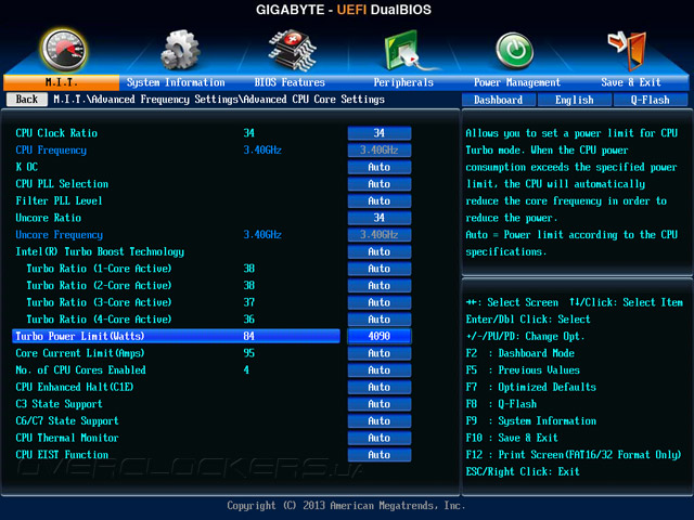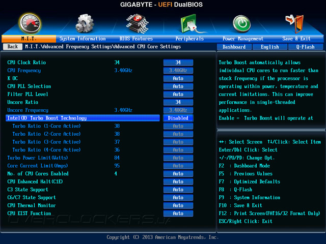 Более тонкие настройки скрываются внутри Advanced CPU Core Settings. Первый пункт — K OC — интригует своим описанием. Опытным путём удалось установить его причастность к форсированию частоты до 3,8 ГГц (используется верхний множитель, доступный в паспортном режиме для Turbo Boost у нашего ЦП) вне зависимости от типа нагрузки на процессор.