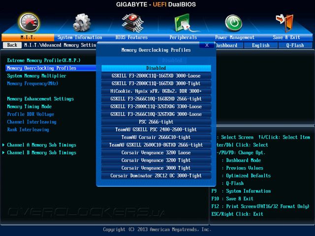 Однако более тонкие настройки памяти находятся в другом, следующим за разделом Advanced Frequency Settings меню — Advanced Memory Setting. Здесь продублирован уже описанный функционал. В области формирования частот, по аналогии с процессорной частью, добавлено право выбора готовых профилей с необходимой частотой и конфигурацией задержек. Впрочем, предложенный набор предназначен для серьёзных оверклокерских комплектов.