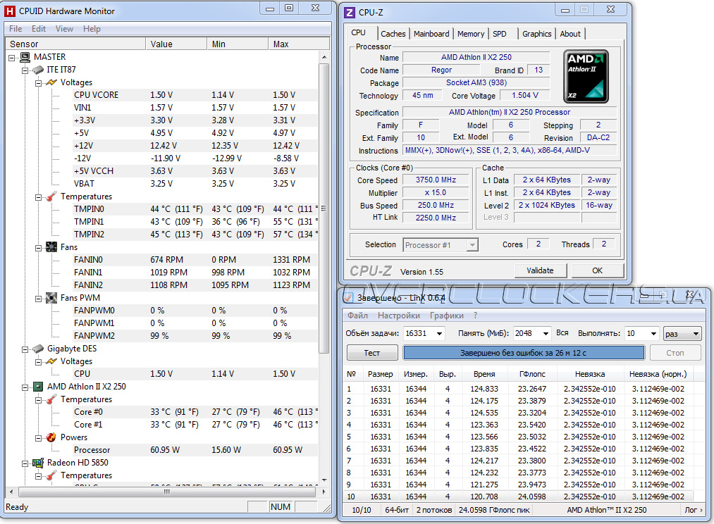 Как ни странно, плата отказалась увеличивать базовую частоту выше 265 МГц. При дальнейшем увеличении срабатывала система защиты от переразгона. Правда, на частоте 268 МГц плата пробовала стартовать, но зависла перед входом в BIOS. Пришлось сбрасывть настройки давно забытой перемычкой Clr_CMOS. Максимальный же разгон Athlon II X2 250 составил 3750 МГц при повышении напряжение на ядре до 1,5 В.