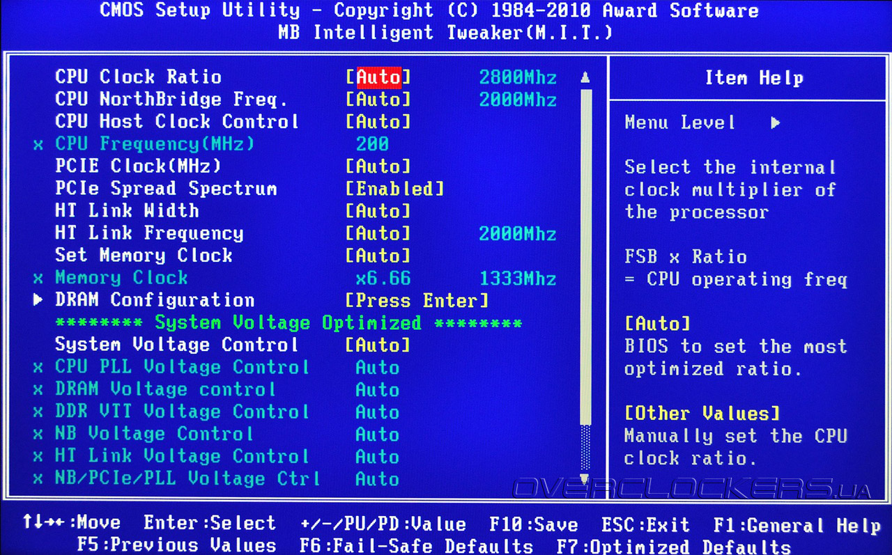 Плата не имеет предустановленных профилей разгона, нет также и функций авторазгона. Сразу видно, что перед нами инструмент для профессионалов. Из BIOS можно регулировать частоту тактового генератора от 200 до 500 МГц, частоту шины PCI-E от 100 до 150 МГц, множитель и ширину шины НТ, частоту памяти и множитель процессора. Стоит заметить, что диапазон регулировок последних параметров сильно зависит от установленного CPU. BIOS платы предлагает гибкие средства регулировки параметров ОЗУ: