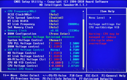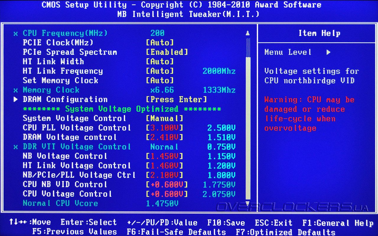 С такими пределами регулировок не сложно сжечь железо, поэтому BIOS услужливо предупреждает об опасно высоких значениях. Приятно, что тут же выводятся текущие значения напряжений. Диапазоны и шаг регулировки всех напряжений представлен в таблице:
