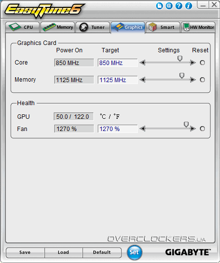 Данная вкладка позволяет управлять разгоном видеокарты: доступно изменение таковых частот GPU и видеопамяти, а также управление скоростью вращения вентилятора. Это немного неожиданно, но установленная в системе Powercolor AMD Radeon HD5850 вполне успешно управлялась из интерфейса Easytune.