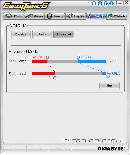На вкладке Smart находится инструмент для управления алгоритмом Smart Fan. Очевидно, что таким образом могут управляться лишь вентиляторы, подключенные к четырехконтактным разъемам материнской платы, если для них включена соответствующая опция в BIOS.