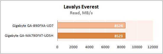 Учитывая то, что контроллер памяти размещен непосредственно в ЦП, равенство результатов вполне ожидаемо. Однако, GA-890FXA-UD7 демонстрирует несколько большую латентность, что можно объяснить «сырой» версией BIOS. Посмотрим, как это отразится на результатах в других тестах.