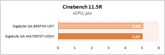 Судя по результатам теста, алгоритм Cinebench R11.5 отдал предпочтение GA-890FXA-UD7, но преимущество не так велико, как того хотелось бы.