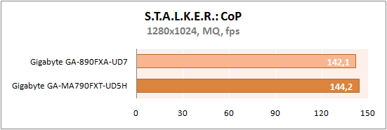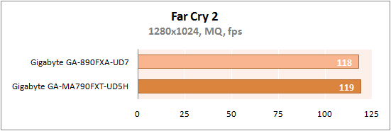 Нельзя сказать, что у GA-890FXA-UD7 проблемы в играх, разница в два fps не существенна, но GA-MA790FXT-UD5H работает чуточку быстрее. Возможно, дело в ранней версии BIOS GA-890FXA-UD7 и обновленные прошивки может поменять расстановку сил.