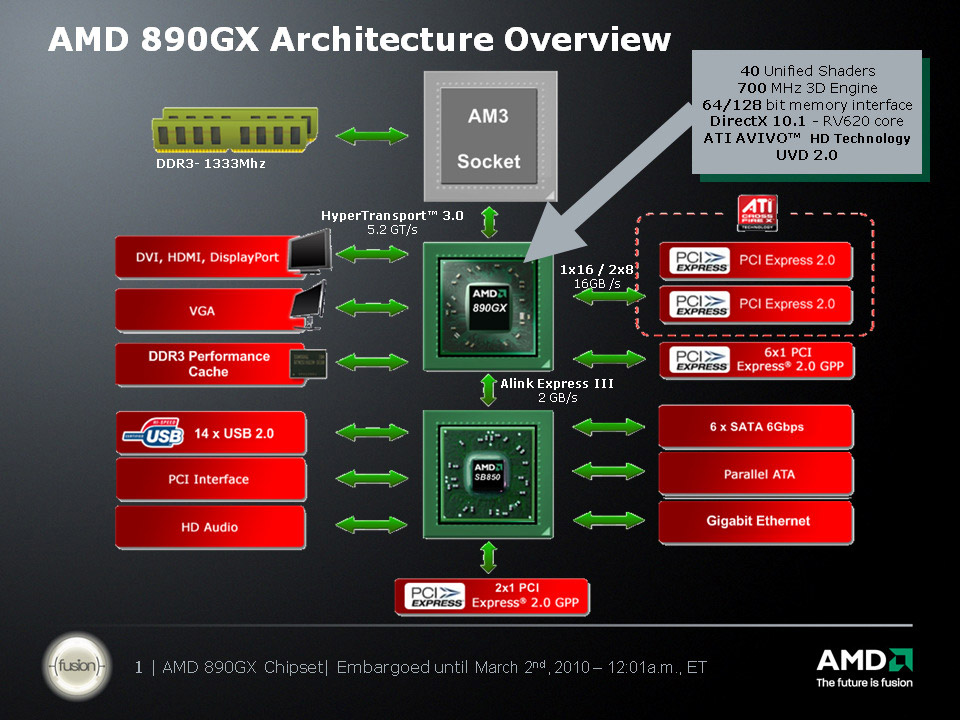 За связь между микросхемами чипсета отвечает шина Alink Express III, основанная на PCI Express, с пропускной способностью 2 ГБайт/с. Южный мост SB850 обеспечивает поддержку до шести портов SATA 6 Гбит/с (RAID 0, 1, 0+1 и 5), а также до 14 устройств USB 2.0. Осталась и возможность подключения устаревших, но все еще используемых IDE-устройств, а также четырех PCI.