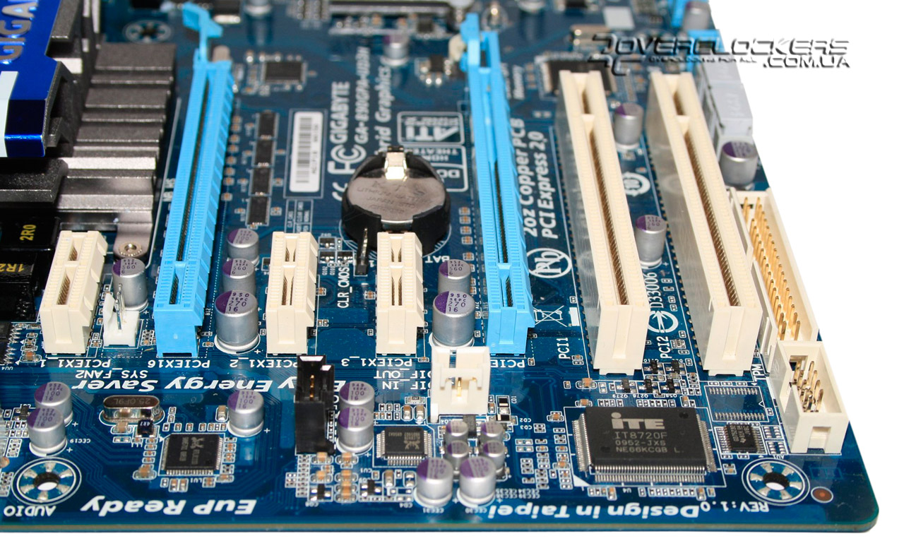 Для расширения функциональности Gigabyte GA-890GPA-UD3H имеет два слота для видеокарт PCI Express x16, два PCI и три PCI Express x1. Слоты PCI-E x16 могут функционировать в режимах 16+0 или 8+8 в зависимости от того, сколько акселераторов установлено в данный момент. Один из разъемов PCI Express x1 расположен очень близко к радиатору северного моста. Однако характерное строение последнего позволит без ограничений устанавливать любые карты расширения.