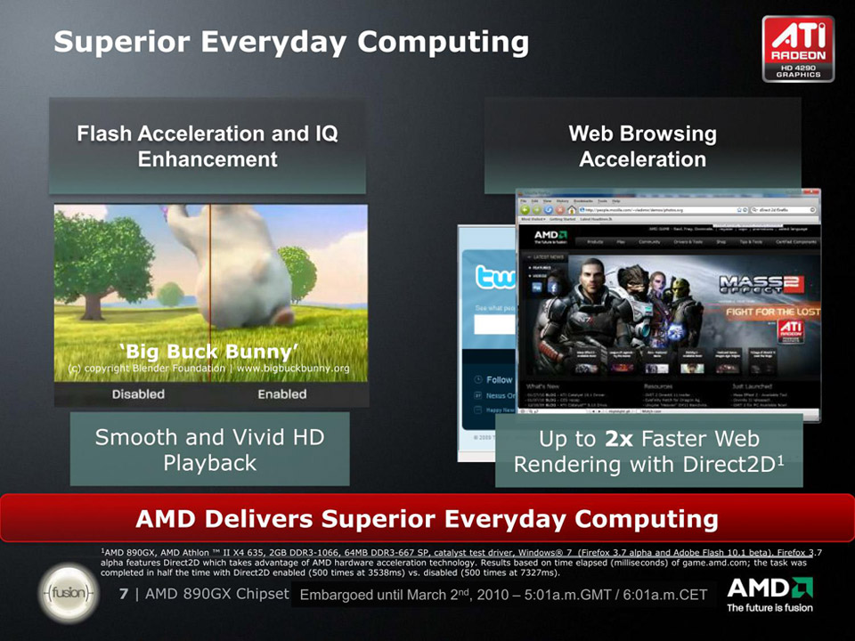 Доведены до ума некоторые опции, которые появились еще в чипсете AMD 785G, такие как поддержка аппаратного декодирования HD-видео, основанного на базе Adobe Flash, и режим «картинка в картинке» при проигрывании видео высокого качества.