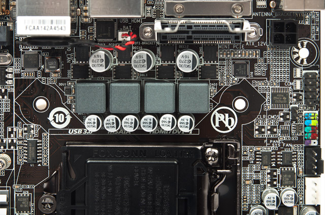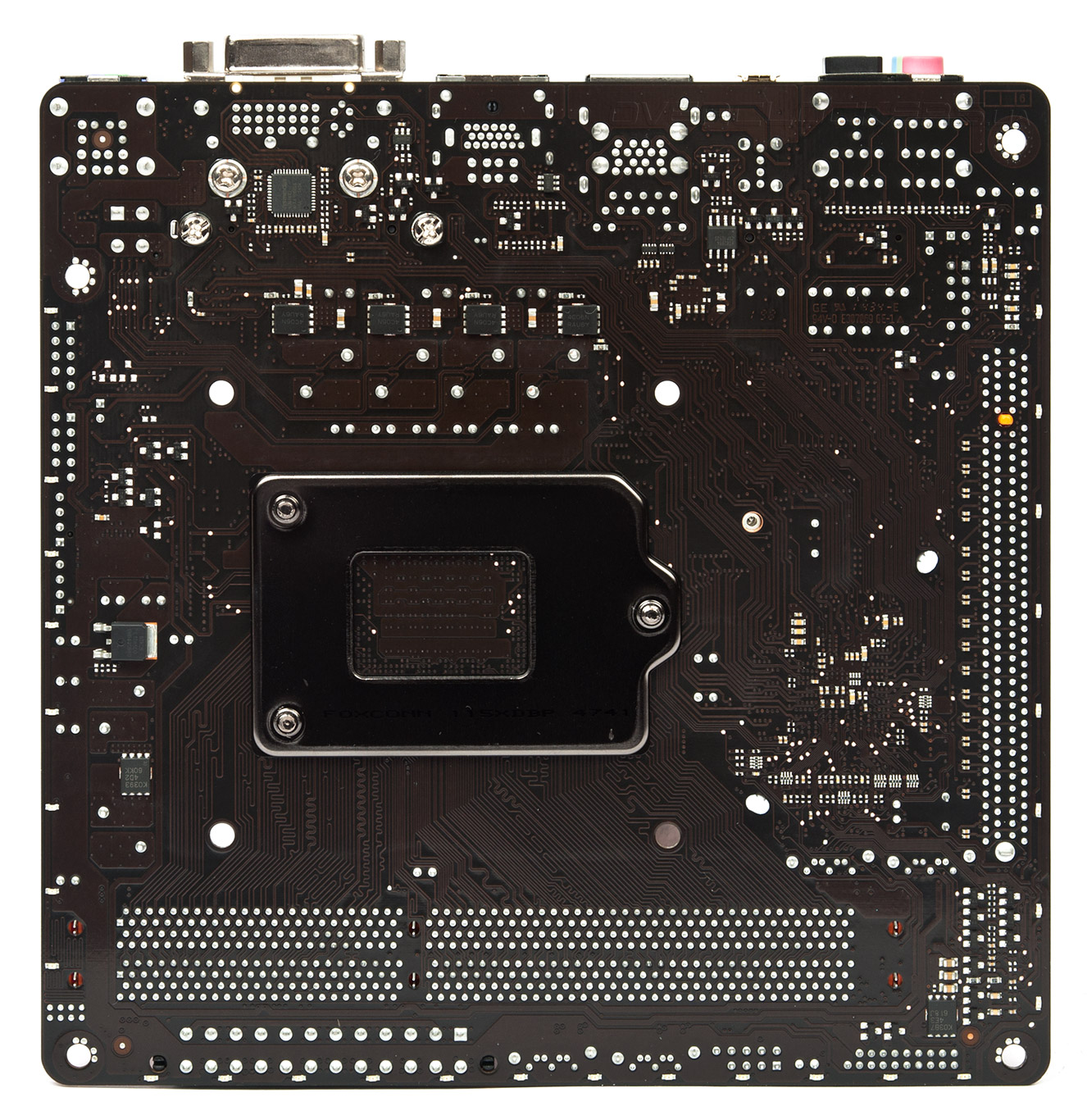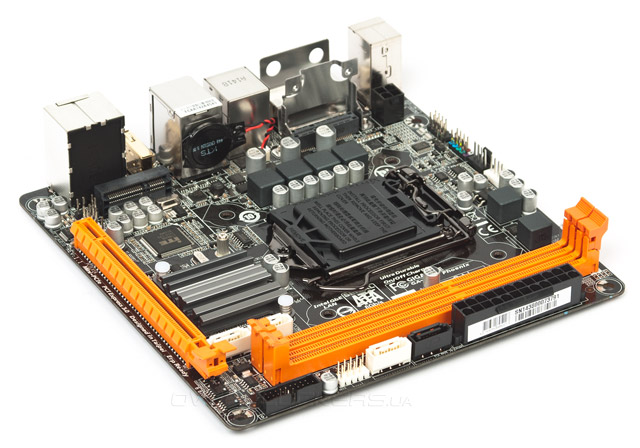 Примечательна она распаянными разъемами mSATA и mini PCI-E для установки компактного SSD и адаптера беспроводных сетей. В комплекте предусмотрены переходники-удлинители для антенн, подключающихся к задней панели устройства. Роль имиджевой составляющей выполняет подсветка, реализованная посредством многочисленных светодиодов, распаянных с задней стороны платы, у самого её края. Для энтузиастов немаловажным будет размещение сокета ЦП — на достаточном удалении от гнезда PCI-E, это позволит расширить список возможных претендентов на роль охладителя процессора.