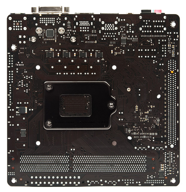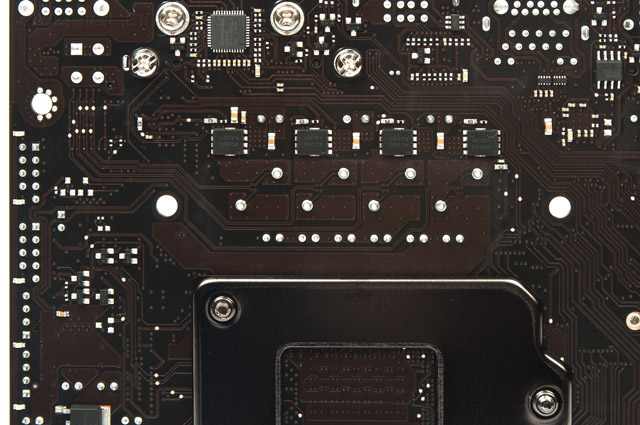 Весьма большая плотность размещения элементов вынудила разработчиков прибегнуть к шагу по размещению некоторого их числа на обратной стороне изделия. Кажется, это удалось выполнить с учётом максимальной совместимости с габаритными усилительными пластинами из состава систем охлаждения ЦП. Непосредственно у отверстий нет ничего, что может помешать процедуре монтажа.