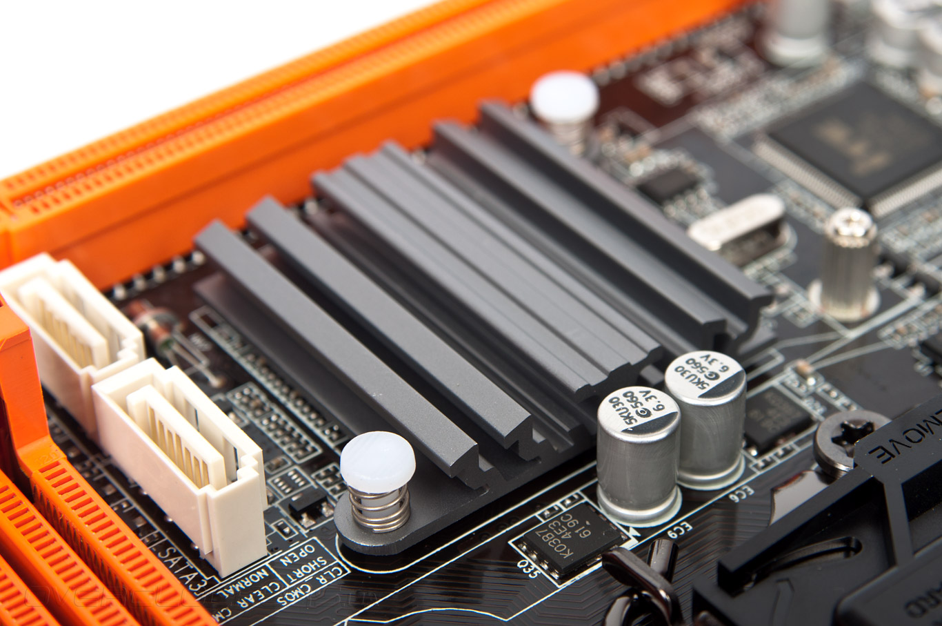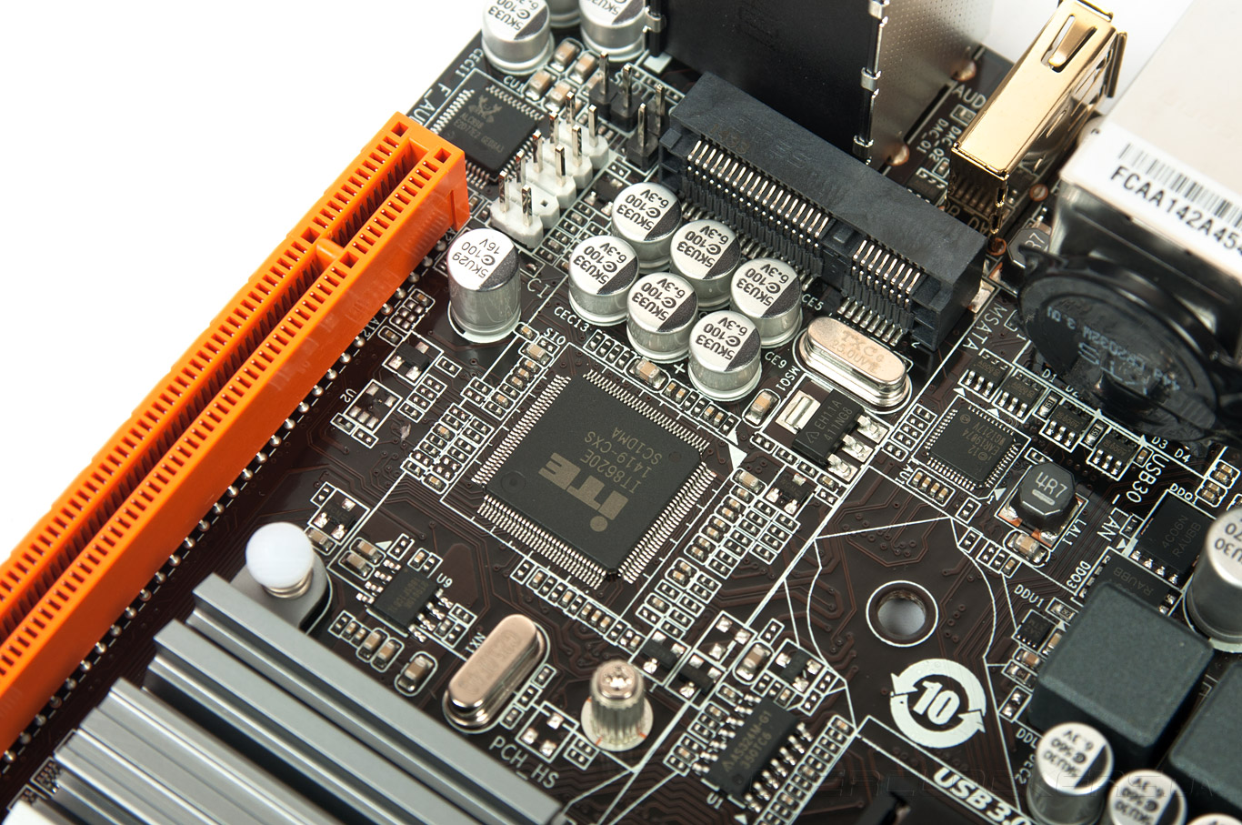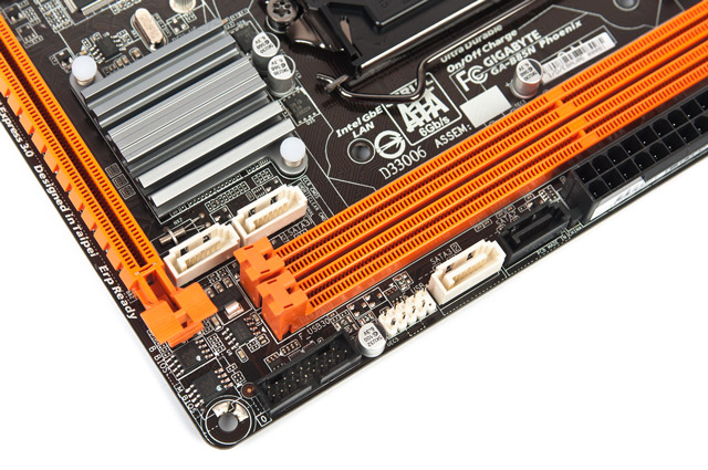У нижнего правого края расположены четыре гнезда для подключения накопителей, один из которых прошлого поколения (3 Гбит/с). Здесь же находятся контактные площадки обеих ревизий USB, заготовленные для нужд гнёзд, входящих в состав корпуса. Снизу модули оперативной памяти захлопываются по месту установки, а сверху, как обычно, закрепляются посредством прижимных рычажков.