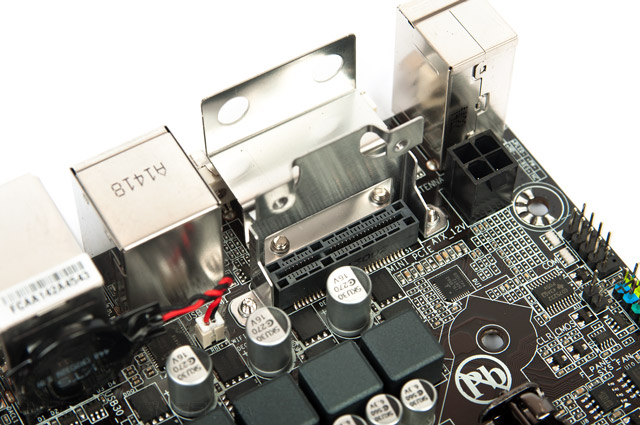 Компактное гнездо PCI-E оснащено соответствующими крепёжными конструкциями, поэтому конечному потребителю остаётся лишь самостоятельно определиться с типом адаптера, для последующего монтажа есть всё необходимое.