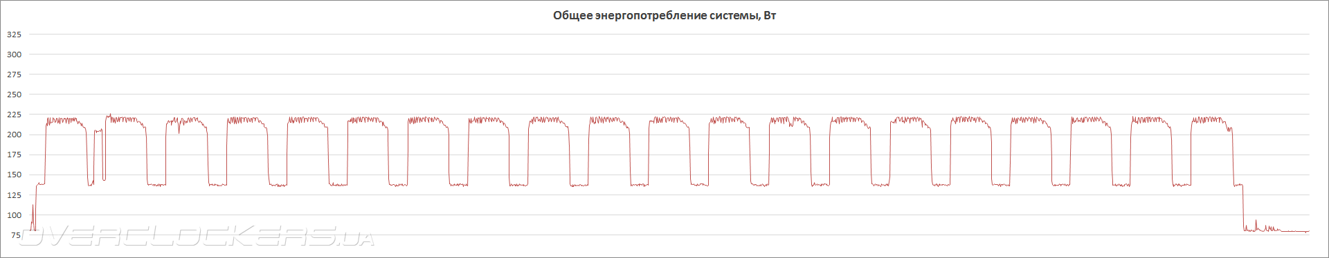 О перегреве в зоне VRM и без особого обдува можно не говорить. Удалось зафиксировать рост температуры до отметки 73 °C, поэтому поводов для беспокойства совершенно нет. Уровень потребления энергии составил 78–226 Вт. Энергосберегающие технологии функционировали, таким образом, вполне корректно.