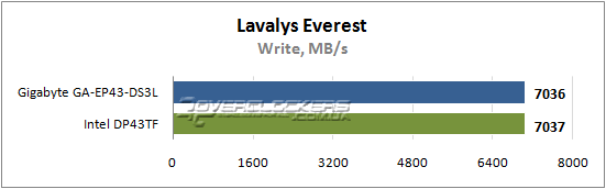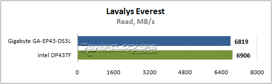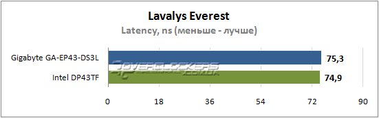 В тесте подсистемы памяти программы Lavalys Everest плата Gigabyte GA-EP43-DS3L демонстрирует чуть меньший результат, чем продукт от Intel, но разница настолько минимальна, что помещается в рамки погрешности измерений.