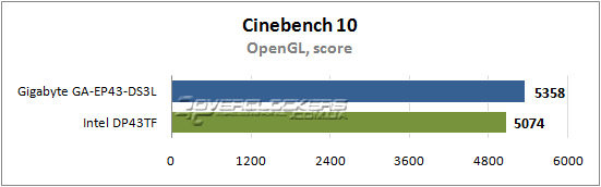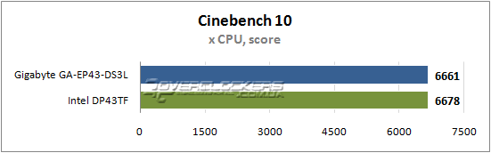 В Cinebench 10 GA-EP43-DS3L неплохо себя проявила при использовании одного ядра для рендеринга сцены и… в графическом подтесте.