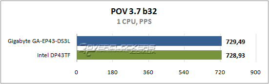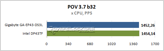 Рендеринг в POV больше дает баллов плате Intel при использовании многопоточности, а решение Gigabyte лучше смотрится при использовании одного ядра.