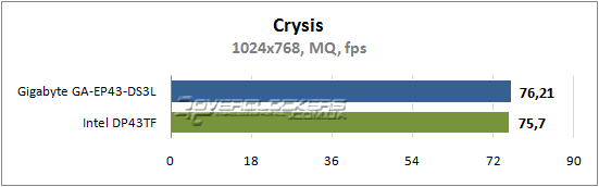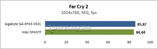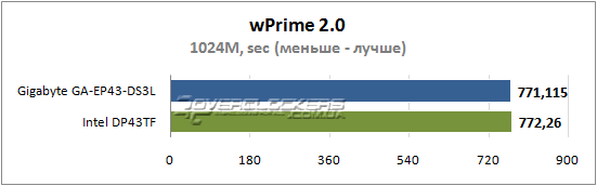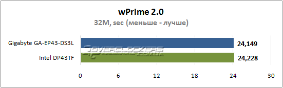 Результат GA-EP43-DS3L в wPrime чуть лучше, чем у оппонента, что дает повод думать все же о погрешности тестирования, чем о реальном преимуществе платы Intel.