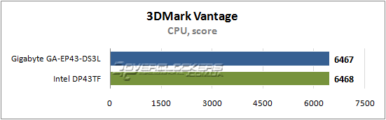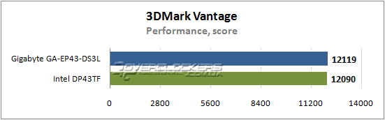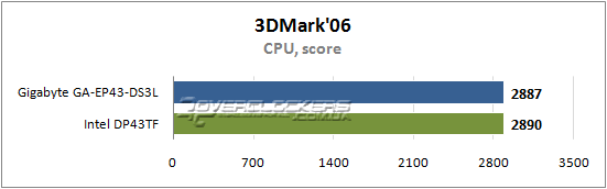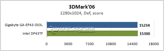 В синтетическом пакете 3DMark’06 результаты примерно одинаковые, с небольшим преимуществом на стороне Intel DP43TF.