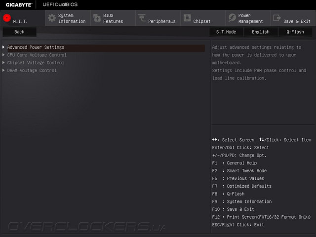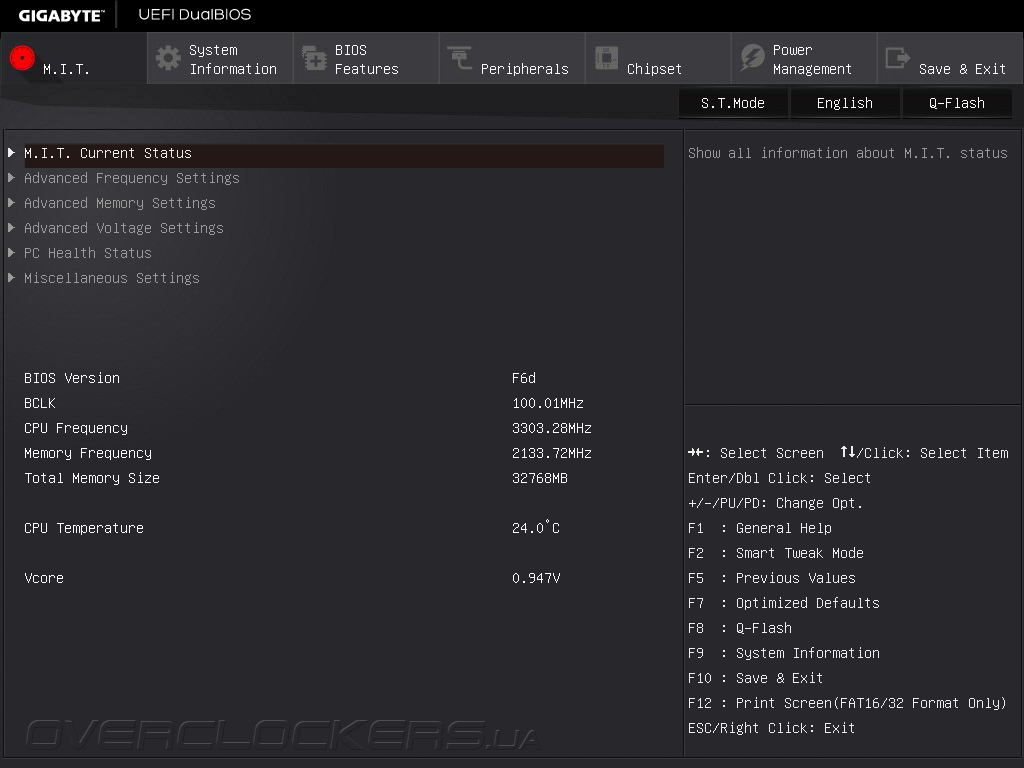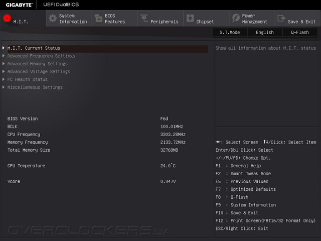 Конечно, для полноценного конфигурирования UEFI Setup возможностей Startup Guide недостаточно, поэтому, пользователям придется воспользоваться классическим режима управления. Все настройки, отвечающие за разгон и аппаратный мониторинг сосредоточены в разделе M.I.T. — Motherboard Intelligent Tweaker, где также отображаются сведения о версии управляющего микрокода и значения ключевых параметров быстродействия.