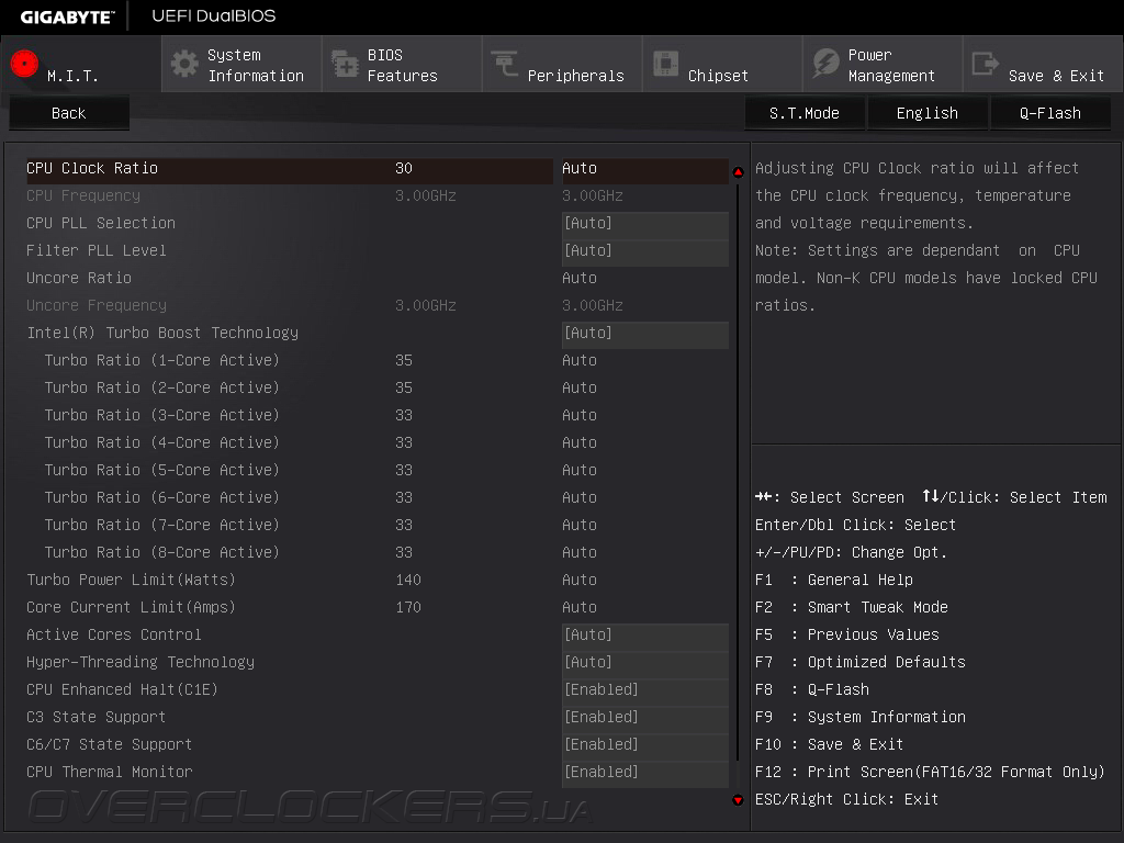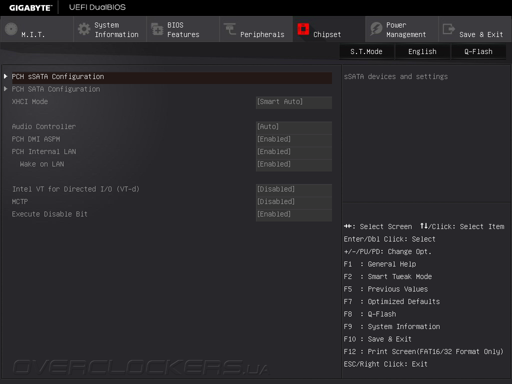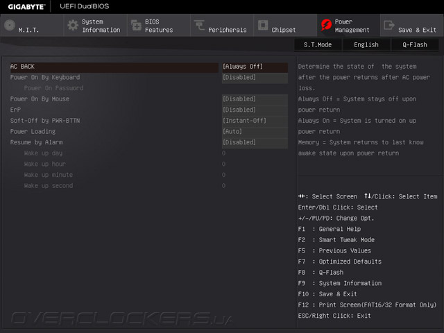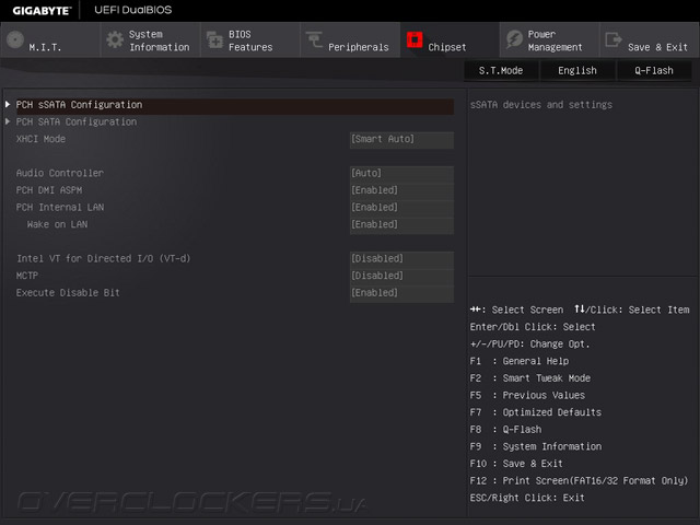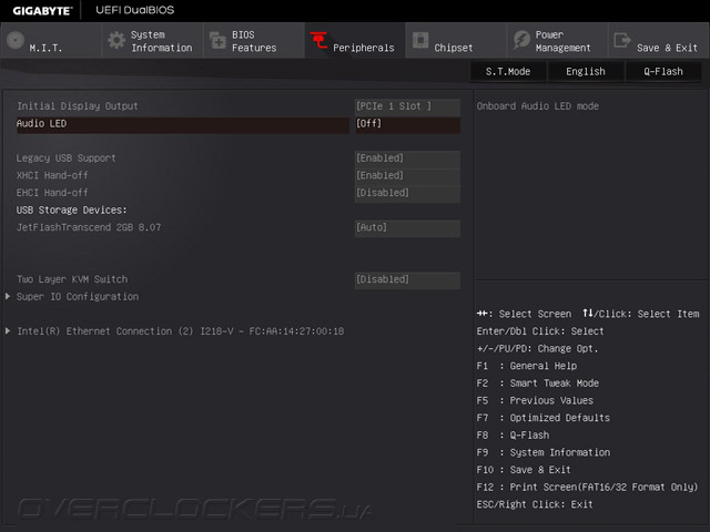 Прежде всего, следует разобраться с аппаратными кнопками, так как кроме привычной Clear CMOS новинка оснащена клавишами BIOS Switch и OC. При помощи первой выбирается EEPROM, с которой будет выполняться загрузка, а вторая отвечает за активацию режима автоматического повышения быстродействия. Подключение к сети Gigabit Ethernet обеспечивает контроллер Intel I218V, который вместе с программой cFos Internet Accelerator позволяет управлять приоритетами доступа приложений и полосой пропускания соединения с Интернет, а для работы периферией служат восемь портов USB 2.0 и десять интерфейсов USB3.0. Последние реализованы путем подключения к чипсету пары четырёхпортовых хабов Renesas uPD720210. Один из портов USB 3.0 (белого цвета) поддерживает фирменную технологию Q-Flash Plus, суть работы которой заключается в прошивке управляющего микрокода с внешнего носителя без необходимости установки процессора и других комплектующих. Данная функция может пригодиться как для обновления UEFI Setup, так и для восстановления системы в случае сбоя. UEFI Setup