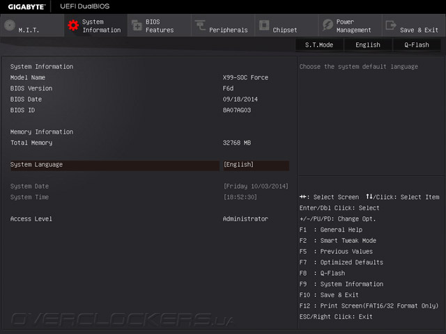 В основе прошивки GA-X99-SOC Force, как и всех современных материнских плат Gigabyte, лежит управляющий микрокод UEFI разработки AMI, стандартное меню которого получило полностью переработанный интерфейс. После входа в UEFI Setup открывается вкладка Startup Guide, позволяющая выбрать язык отображения, после чего пользователи попадают в меню, где сосредоточены ключевые настройки, необходимые для первого запуска системой платы, такие как установка даты и времени, включение функции ускоренной загрузки, выбор режима работы дисковой подсистемы и задание порядка инициализации загрузочных устройств.