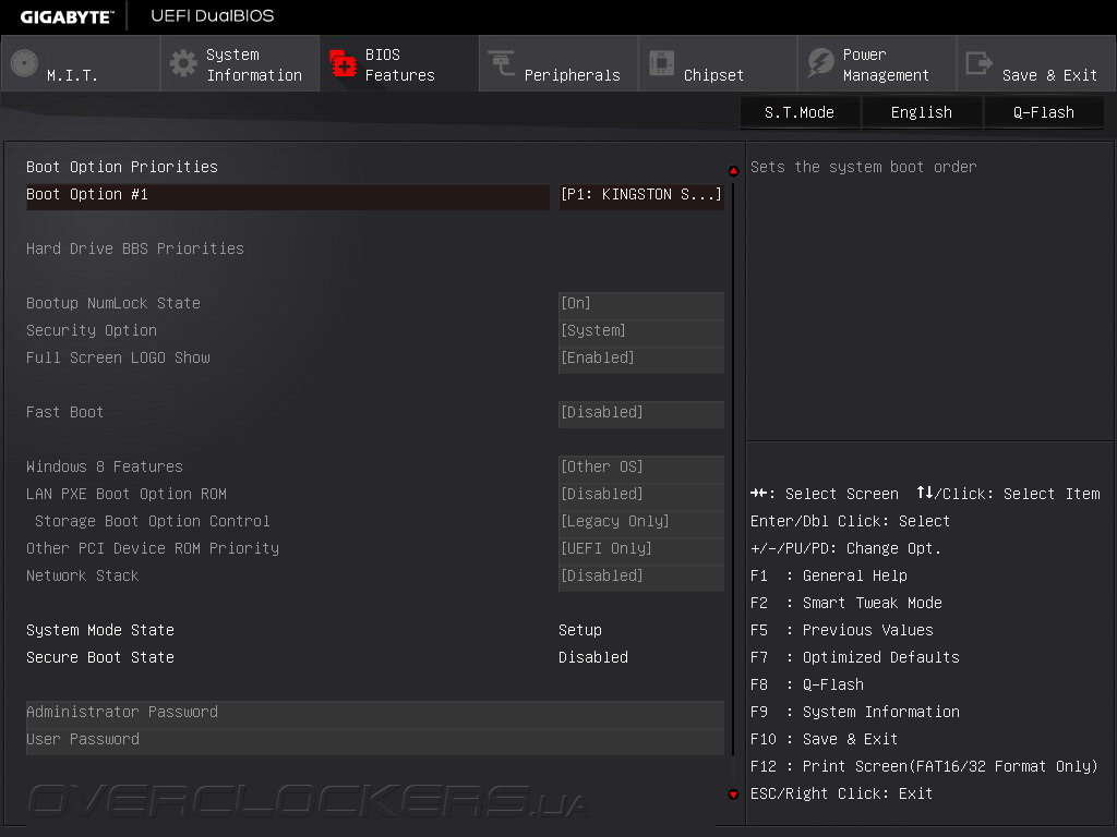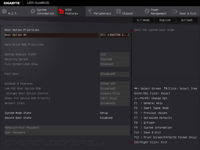 В разделе System Information отображаются данные о версии управляющего микрокода и выбирается язык отображения меню, а в BIOS Features задаются параметры загрузки, в том числе порядок инициализации дисковых накопителей.