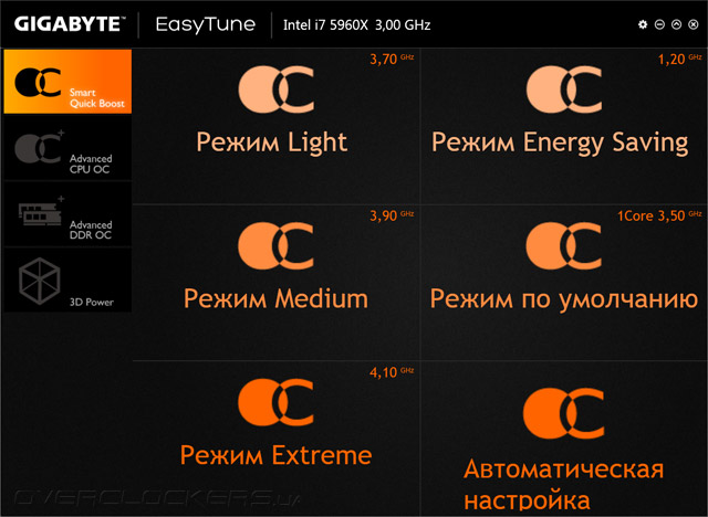 На DVD-диске, которым комплектуется Gigabyte GA-X99-SOC Force, помимо всех необходимых драйверов нашлось немало программ, которые могут пригодиться во время проведения оверклокерских экспериментов. Одна из них — EasyTune, предназначенная для управления параметрами быстродействия. После запуска утилиты открывается вкладка Smart Quick Boost, где пользователи могут выбрать один из трех предустановленных профилей повышенной производительности или запустить функцию автоматического разгона.