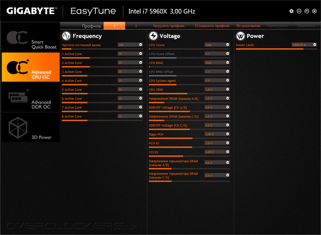 Управление напряжениями на центральном процессоре, системной логике и подсистеме ОЗУ рассредоточены по трем отдельным вкладкам.