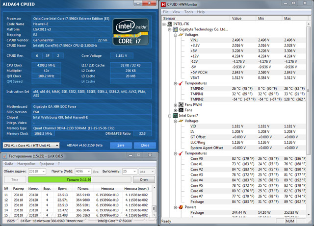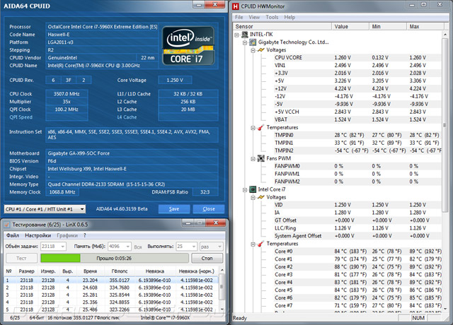 Благодаря значительному запасу прочности и функциональной прошивке Gigabyte GA-X99-SOC Force процесс разгона Intel Core-i7 5960X прошел достаточно успешно, но с некоторыми нюансами. Для начала напряжение VRIN было зафиксировано на уровне 1,8 В, а параметр CPU VRIN Loadline Calibration выставлен в значение High. Далее, на процессор было подано Vcore=1,25 В при одновременном повышении частоты до 4300 МГц. В таком режиме температура вычислительных ядер оставалась подозрительно низкой даже после запуска стресс-теста LinX 0.6.5, зато, насторожили нестабильные показатели ГФлопс, что является верным признаком включения режима пропуска тактов. Вероятно, из-за ошибки в текущей версии прошивки показания температурных датчиков некорректно отображаются в подавляющем большинстве диагностических программ, что не позволяет вовремя идентифицировать перегрев.
