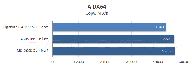 Измерение пропускной способности ОЗУ в информационно-диагностической программе AIDA64 дало противоречивые результаты. С одной стороны, новинка опередила соперниц в подтесте чтения и выступила наравне с ними в сценарии записи данных и по части латентности, но с другой стороны, при копировании данных системная плата Gigabyte заметно отстала от конкуренток. Будем надеяться, что это вызвано недоработками управляющего микрокода, либо ошибками в текущей версии тестовой утилиты.