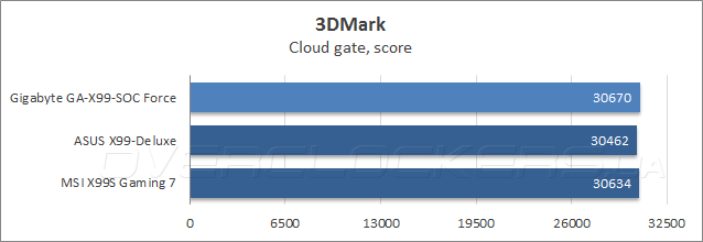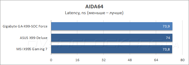 В части разгона базовой частоты Gigabyte GA-X99-SOC Force порадовала результатом в 175 МГц, что на данный момент является самым высоким достижением среди системных плат для платформы LGA2011-3.