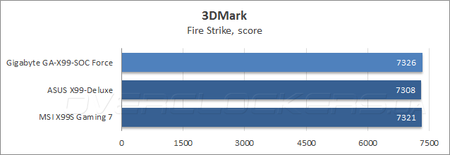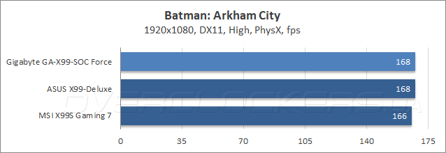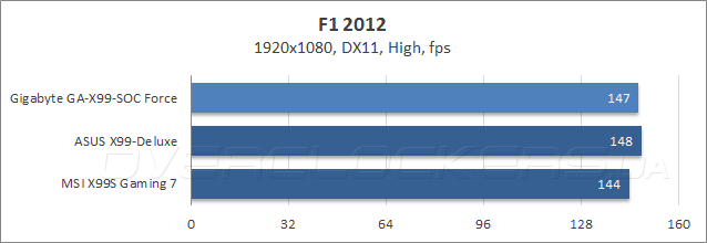 Тестирование в современных компьютерных играх лишь подтверждает высокие результаты, полученные GA-X99-SOC Force в бечмарке 3DMark. Во всех трех дисциплинах материнская плата Gigabyte показала максимальные, или близкие к этому значения fps.