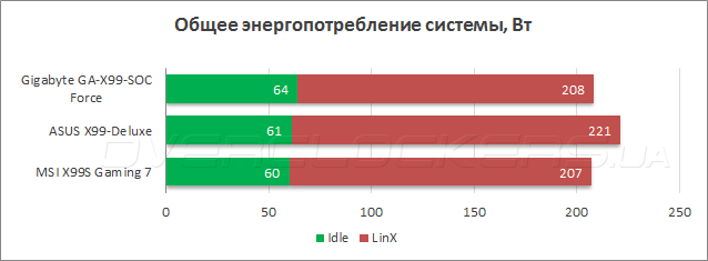 В режиме максимальной нагрузки GA-X99-SOC Force продемонстрировала образцовую экономичность, сравнимую с материнской платой MSI, тогда как при простое модель Gigabyte показала наибольший уровень энергопотребления.