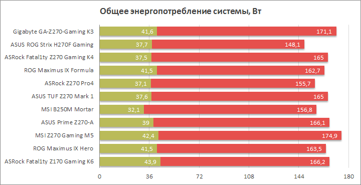 Замеры выполнялись после прохождения всех прочих тестов в «устоявшемся» режиме компьютера при помощи прибора собственной разработки. Для создания нагрузки использовался профиль In-place large FFTs в составе утилиты Prime95 (28.10). Производился расчёт среднего значения потребления тестового стенда «от розетки» на протяжении восьми минут работы программы, а затем, после завершения теста, ещё минуту замерялся уровень, соответствующий состоянию простоя системы.