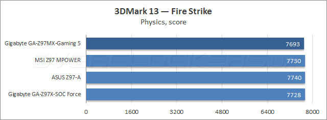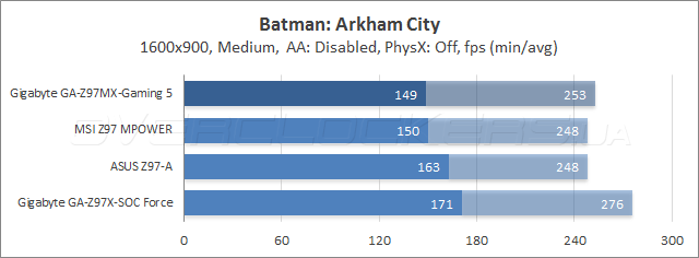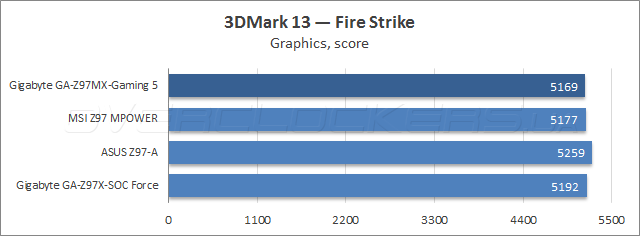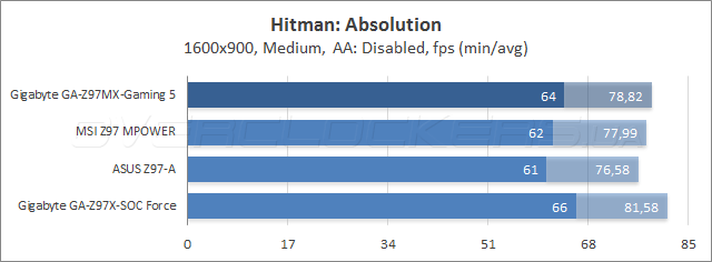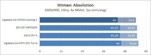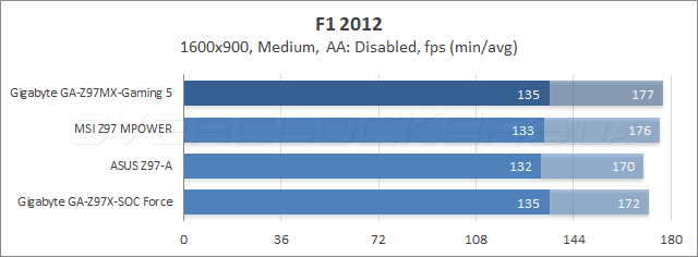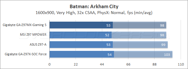 Весьма интересными получились измерения в играх. В части из них GA-Z97MX-Gaming 5 показывает посредственный уровень быстродействия, однако есть и более выдающиеся показатели. Но как бы там ни было, разница между всеми ними не является существенной.