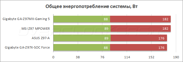 Замеры выполнялись после прохождения всех прочих тестов в «устоявшемся» режиме компьютера при помощи прибора Luxeon AVS-5A. Методика заключалась в фиксации средневзвешенного значения потребления тестового стенда «от розетки» во время прохождения теста Prime95 с применением профиля In-place large FFTs, а также при простое компьютера после завершения теста.