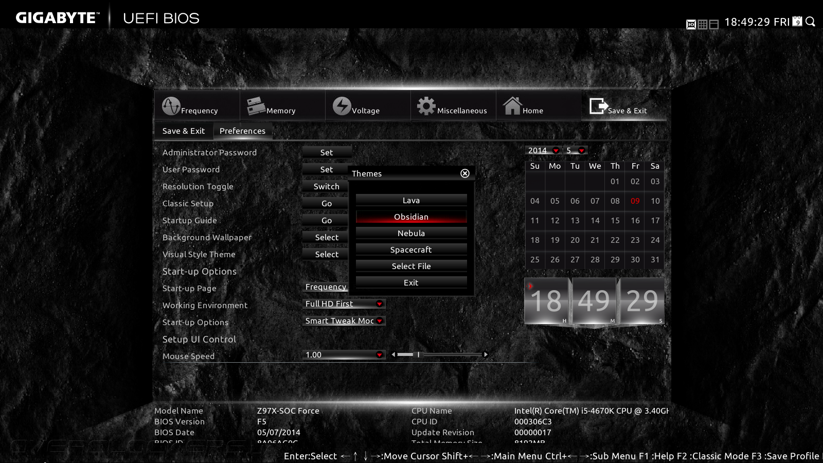 Smart Tweak Mode у этой модели оказался лишён виденных прежде недостатков в отображении элементов меню, да и процедура навигации при помощи клавиш теперь стала более отзывчивой и приятной. Памятуя о кнопке F2 можно переключаться между тремя режимами настройки, иначе пока не выйдет, поскольку нажатие указателем мыши на пиктограммы в правом верхнем углу ни к чему не привели. Ещё немало удивило цветовое исполнение этого меню, свойственное материнским платам оверклокерской направленности, где преобладают оранжевые оттенки в том числе и в дизайне устройств. Здесь же кроме единственной темы Lava ни оказалось больше никаких, хотя в прошлый раз новая заставка с именем Obsidian казалась буквально созданной для игровой серии материнских плат.