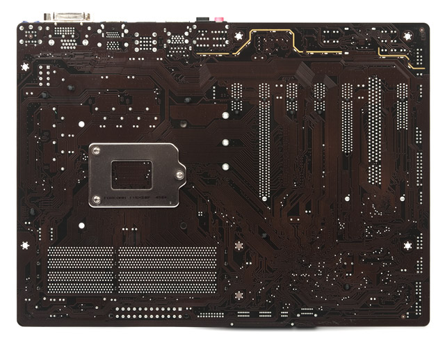 Относительно старших решений она отличается, как уже отмечалось, упрощенным подходом в дизайне (раскраске) элементов, отсутствием вспомогательных индикаторов, органов управления, упрощающих эксплуатацию в режиме открытого стенда. Оверклокеры не смогут найти здесь переключателей между двумя микросхемами ПЗУ и точек для выполнения замеров системных напряжений.