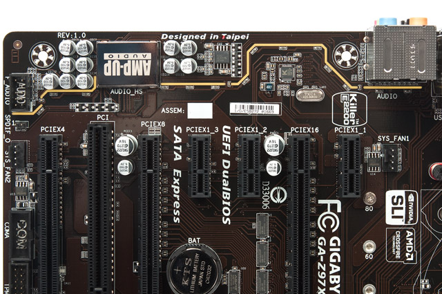 Шестнадцать линий PCI-Е благодаря четырём коммутаторам ASM1480 могут делиться поровну между двумя верхними гнёздами. Нижнее использует ресурсы PCH, но не монополизирует четыре линии, а разделяет их между ещё тремя самыми простыми PCIEX1. То есть в случае их использования PCIEX4 полностью исключается из состава системы. Для этого распаяны два коммутатора ASM1440.