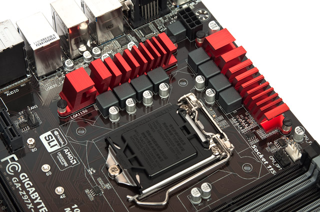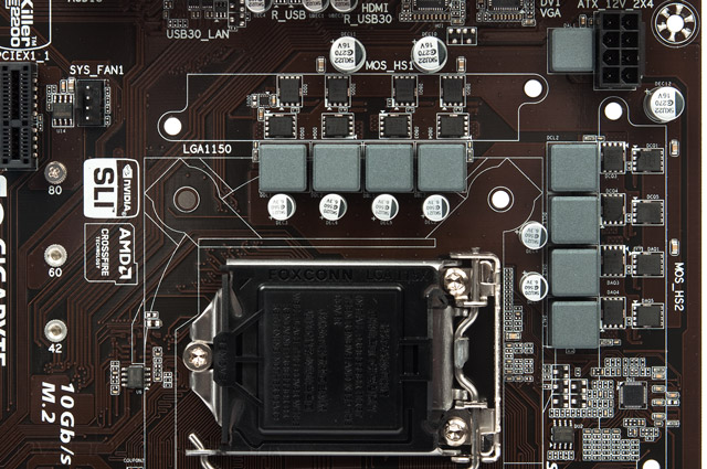 Схема стабилизатора точь-в-точь повторяет подход, реализованный у GA-Z97X-UD3H. В роли ШИМ-контроллера используется ISL95820 от Intersil Corporation. Он является четырёхканальным, а значит здесь используется удвоенное число элементов в составе каждого. SiRA12DP от Vishay Intertechnology выступают в роли силовых элементов.