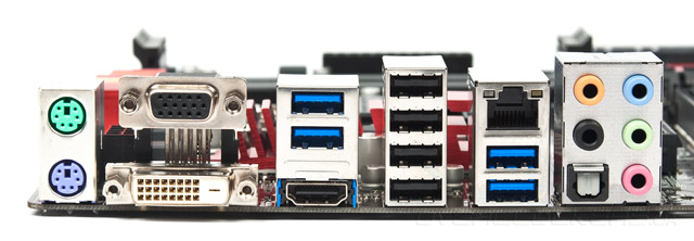 Задняя панель максимально насыщена. Её наполнение без изменений кочует от одного продукта Gigabyte к другому. Цифровые видеовыходы дополнены конверторами уровней видеосигнала PTN3360D и ASM1442.