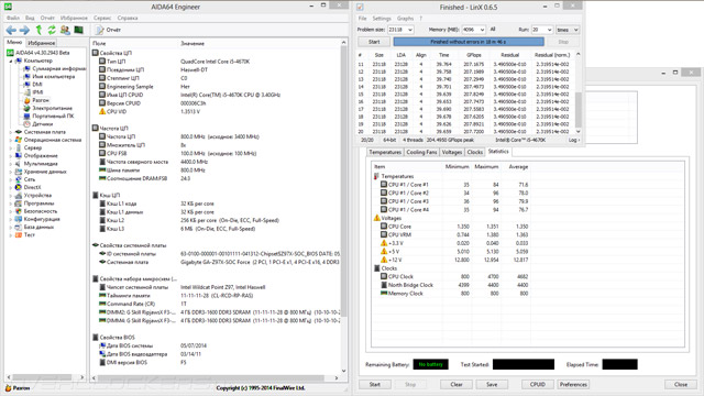Объём оперативной памяти, используемой для нужд теста, был увеличен до 4 Гбайт, чтобы довести продолжительность каждого из этапов тестирования до сопоставимого с прошлой версией. Увеличение его до 5 Гбайт доводит положение дел до критического, и уже за вторым-третьим заходом включается троттлинг (хотя и величина GFlops при этом весомо увеличивается). Потребление энергии при этом достигает величин 88–295 Вт, причём характер потребления оказывается абсолютно иным, наблюдаются постоянные броски на несколько единиц, а то и десятков ватт, чего не происходило с LinX 0.6.4. В таком режиме работы температура в области размещения силовых элементов достигала 55 °C, а верхняя грань радиатора прогревалась лишь до 42 °C.
